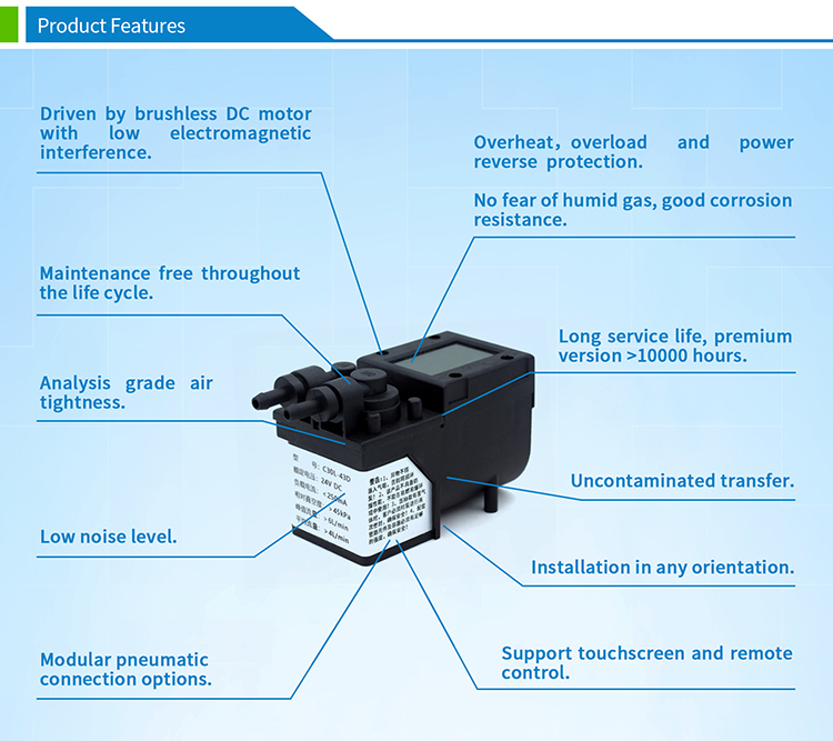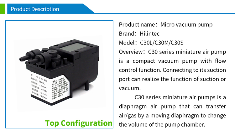 The C30 series miniature air pump is a compact vacuum pump with integrated speed and flow control function. Connecting to its suction port can realize the function of pumping or vacuuming.