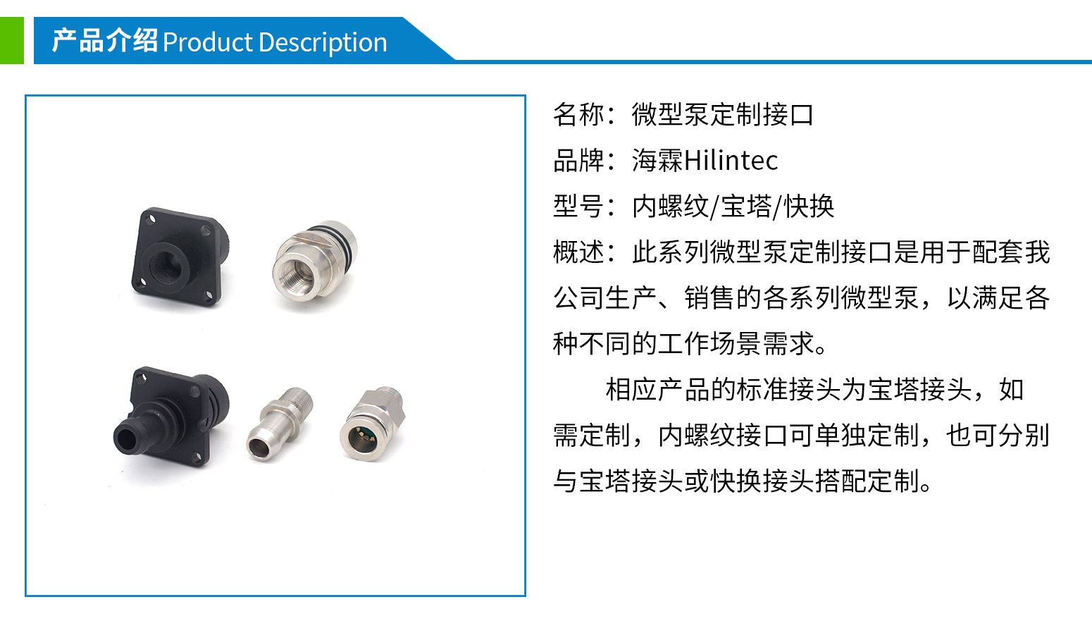 微型泵定制接口是用于配套我公司生产、销售的各系列微型泵,以满足各种不同的工作场景需求。