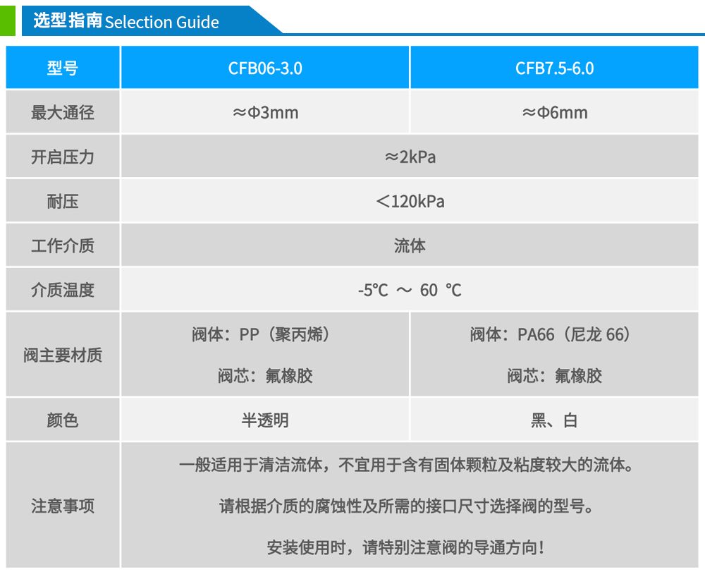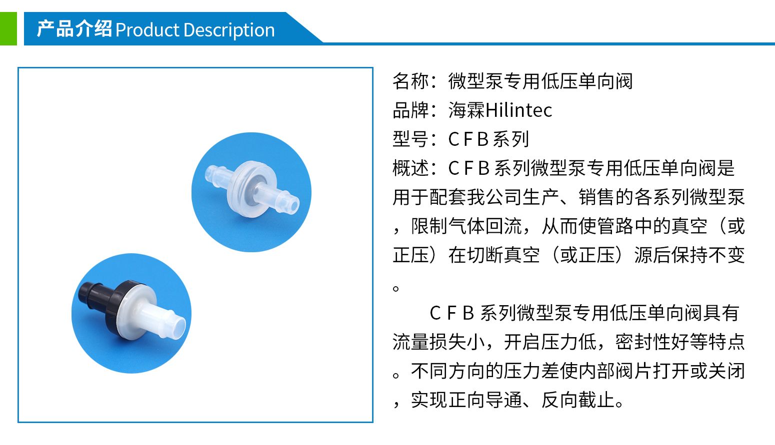 CFB系列微型泵专用低压单向阀是用于配套我公司生产、销售的各系列微型泵,限制气体回流,从而使管路中的真空(或正压)在切断真空(或正压)源后保持不变。