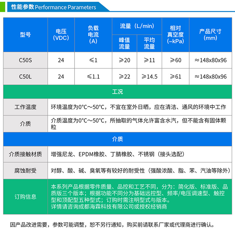 点击下载 C50系列电压频率调速型 隔膜真空泵 无刷电机 远程启停控制 微型泵 产品数据手册