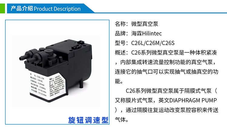 点击下载 C26系列旋钮调速型 隔膜真空气泵 无刷电机 可调速 微型泵 产品数据手册