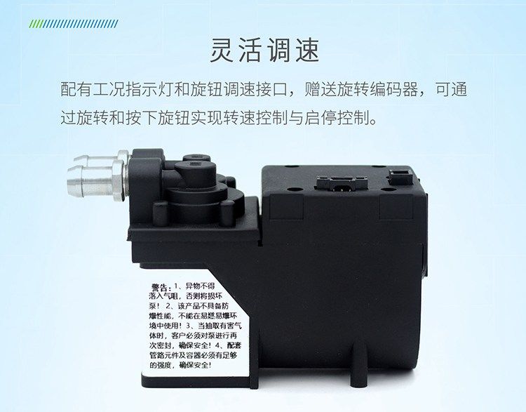 特别适用于:流量1~4L/min、排气通畅的气体采集或分析领域。本型号产品工况指示灯和旋钮调速接口,赠送旋转编码器,气密性好、可靠性高。