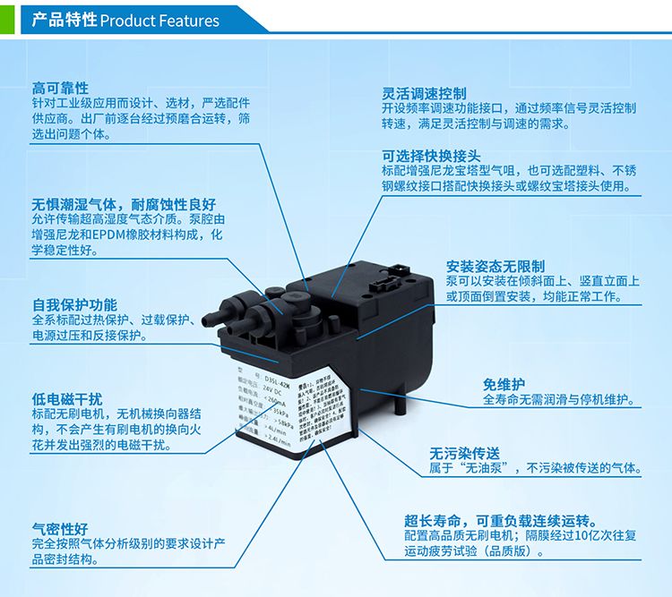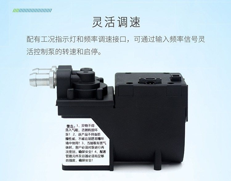 特别适用于:流量2~4L/min、排气有阻力的气体采集或分析领域。本型号产品开设频率调速接口,精准调速,气密性好、可靠性高。